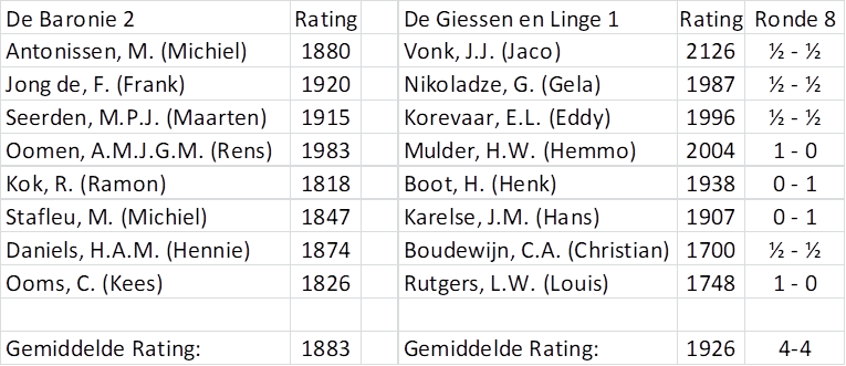 De Baronie 2 heeft een mooi resultaat gehaald tegen het sterke De Giessen en Linge 1. Op de eerste 6 borden hadden onze spelers een sterkere tegenstander. Alleen op bord 7 en 8 waren wij sterker.